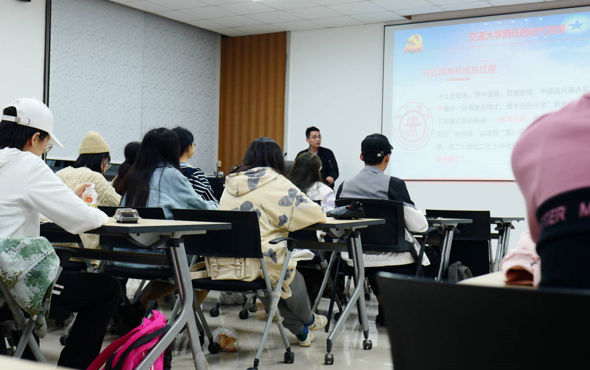 杨光宝老师首先介绍了交通大学西迁的历史,用充满史实的故事帮助“青马”学员了解当时的历史背景。接下来,他以习近平总书记给西迁老教授的回信内容及在西安交通大学实地考察时的重要讲话精神为指引,结合自身到西安交通大学参观交流的经历提出了本次授课的主题,他指出,“西迁精神”的核心是爱国主义,精髓是听党指挥跟党走,与党和国家、与民族和人民同呼吸、共命运,具有深刻的现实意义和历史意义。杨老师呼吁“青马”学员将西迁精神落实到爱国奋斗行动中去,心怀先辈、脚踏山河,思及无涯,干到实处。