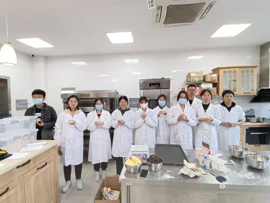 活动开始前,烘焙科学俱乐部负责人提前布置好活动现场,将食材准备齐全,要求参加活动的同学们按照食品级实验室操作要求,穿好实验服,清洁双手。随后,活动进入蛋挞制作环节,同学们在动手体验的过程中增进彼此了解,充分体会到手工制作的参与感和成就感。蛋挞出炉后,同学们也吃到了自己亲手做的食物,并合影留念。