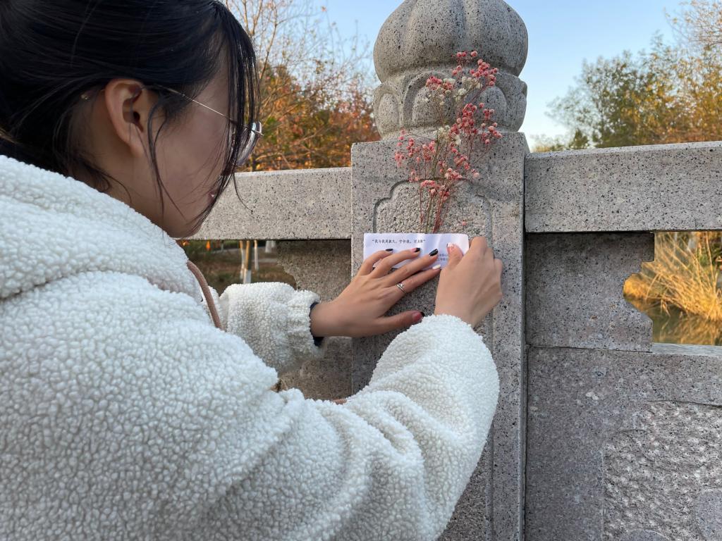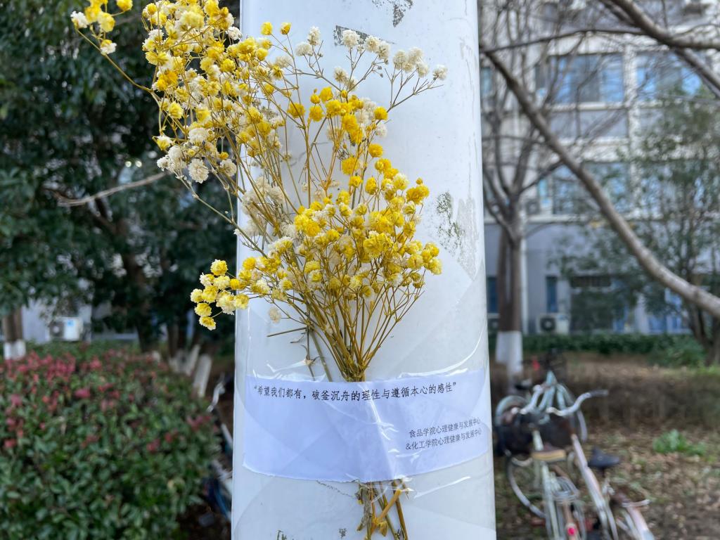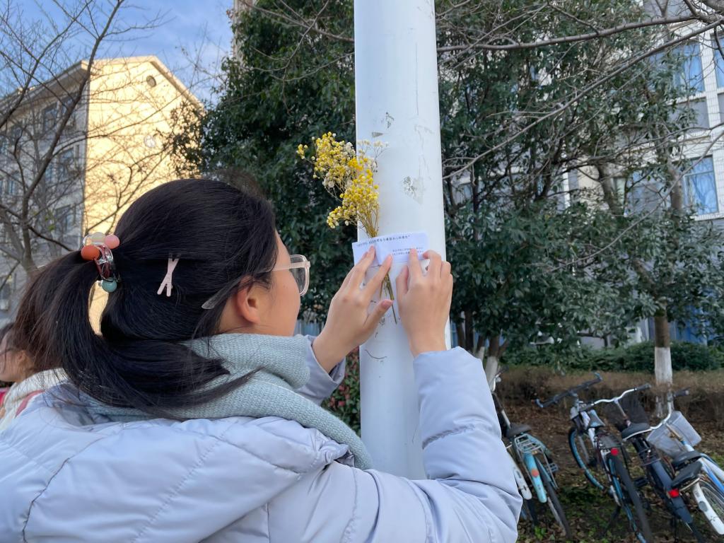 心理中心负责校园南区,化工学院心理中心负责北区,分别开展张贴暖心祝福语、放置应急小物件的工作。活动举办阶段,遍布在校园里多个角落的祝福语被许多同学发现,应急小物件也受到同学们的青睐,被有需要的同学摘取,并拍照传递温暖关怀。