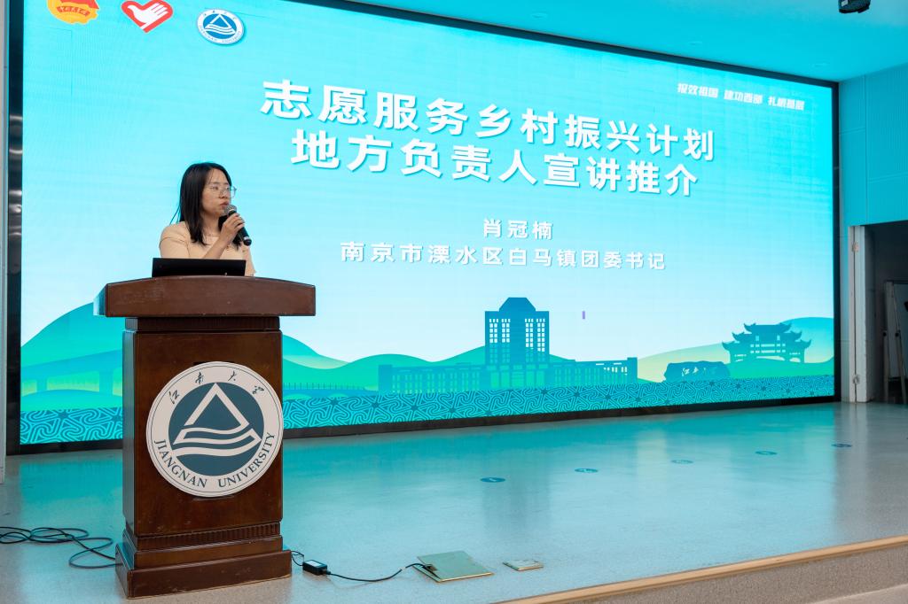 肖冠楠作宣讲推介,生动展现南京溧水区白马镇产业特色,她指出,白马镇依托国家农业高新技术产业示范区优势,为青年志愿者提供广阔的实践平台和发展机遇,诚挚邀请江南学子加入乡村振兴队伍:在这里,你们不仅是政策的执行者,更是乡村发展的创新者与见证者。
