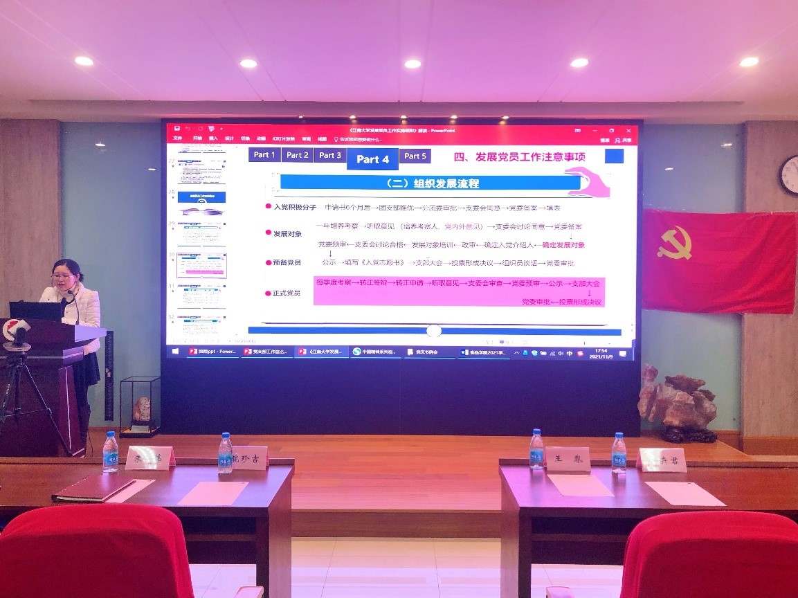 发展党员工作实施细则》。她介绍了学院学生党员的总体情况,对在场的基层党务工作人员培训了党员发展流程和党员发展材料撰写要求,强调了发展党员工作的注意事项等。