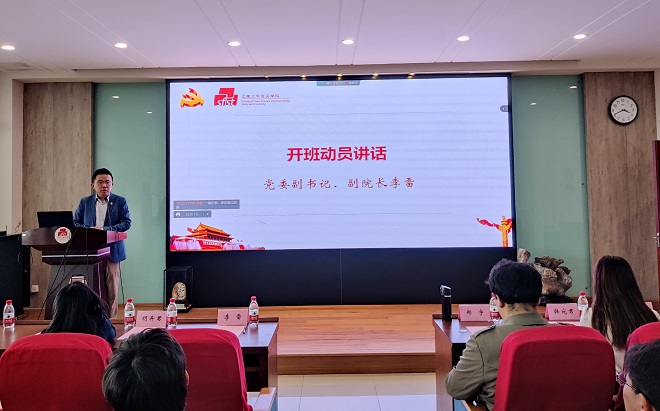 2022年入党积极分子培训班开班仪式在庄严的国歌声中拉开帷幕。在观看了中国共产党国际形象网宣片《CPC》后,李雷代表学院党委对参加此次培训班的学员表示热烈欢迎,他介绍了学院“全链条式”党员教育管理体系,并对学员提出三点要求:一是笃定对党的忠心,提高思想觉悟;二是坚定善学的恒心,按时完成任务;三是彰显行动的决心,理论付诸实践,将对党的理想信念与追求转化为“强国有我”的行动自觉。