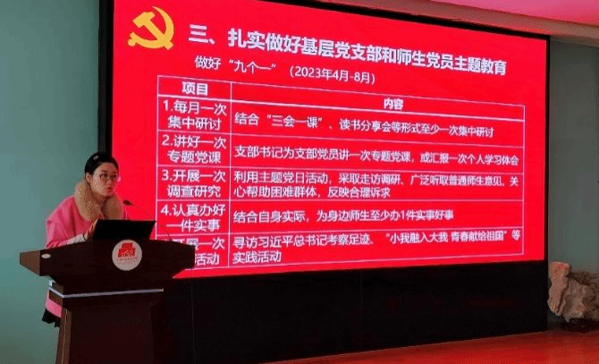 4月28日学院党委组织了主题教育动员部署会暨读书班开班仪式。傅莉莉书记指出,全体中层领导干部要深刻认识主题教育的重大意义,牢牢把握主题教育的目标要求,不断增进对党的创新理论的政治认同、思想认同、理论认同、情感认同,把主题教育和落实立德树人根本任务紧密结合起来。在读书班开班仪式上,院党委书记傅莉莉带头领学了习近平总书记《在学习贯彻习近平新时代中国特色社会主义思想主题教育工作会议上的重要讲话精神》,范大明院长、李雷副书记进行了重点发言。随后,学院党委分别召开了教师党支部书记、学生党支部书记参加的主题教育动员部署会,要求各基层支部发挥好支部战斗堡垒、干部示范引领、党员模范带头的重要作用,认真落实九个一的任务要求,畅通主题教育“最后一公里”。