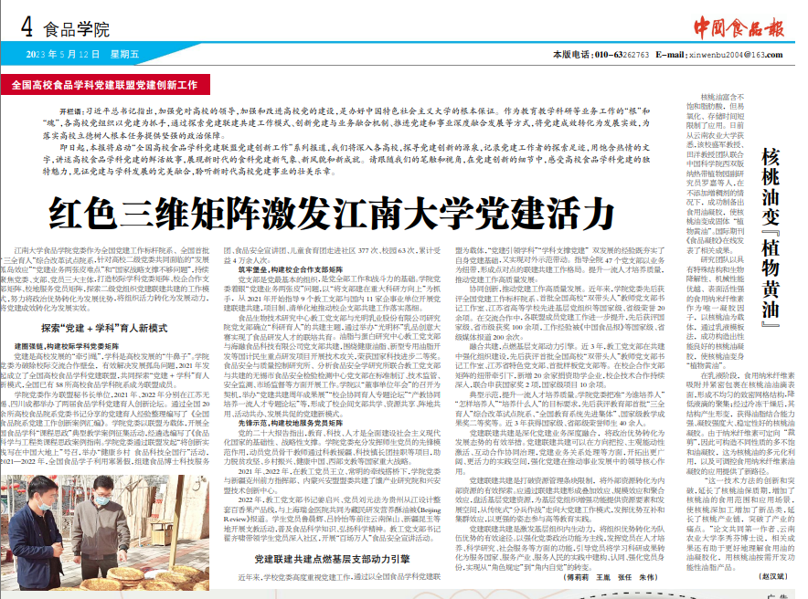 与《中国食品报》联合策划全国高校食品党建创新工作巡礼专栏,报道全国各高校食品在党建引领、立德树人、主题教育等方面的创新做法。