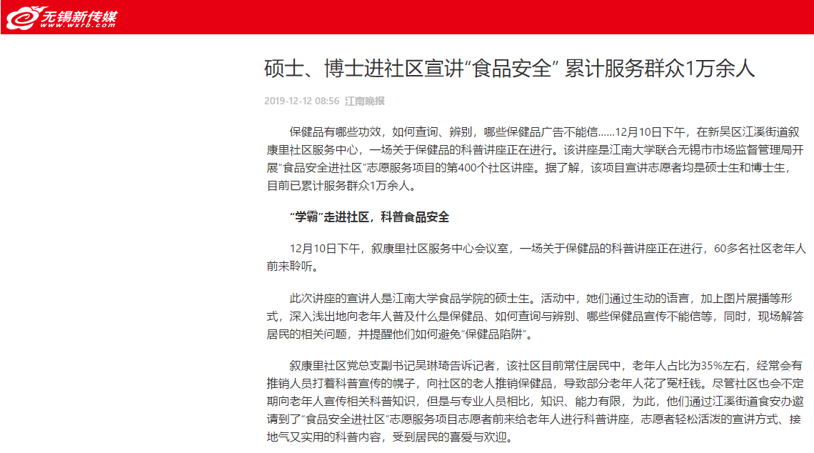 12月23日,无锡日报以《江大食品安全志愿团队“传承”7年走进377个社区》为题,深度报道了该项目创立七年以来的发展历程,志愿者团队历经艰辛,仍不忘初心,砥砺前行,彰显了耽美漫画