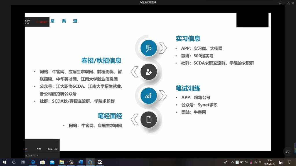 2020届拿到宝洁产品供应部offer的唯一本科生陈慧就自己的求职签约经历作了详尽的介绍,包括前期的面试准备,线上测评中的英文笔试、性格测试、游戏题等,以及面试后的总结和复盘。她推荐了很多高效的就业软件和求职法则,并建议同学们在面试前做好充分准备,总结常见问题,时刻关注信息渠道,用心对待面试。
