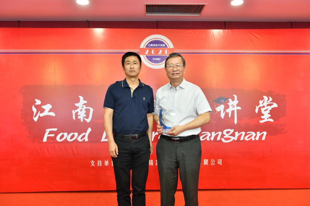 党委副书记戴月波老师为吴子丹教授赠送江南食品大讲堂纪念杯并合影留念。