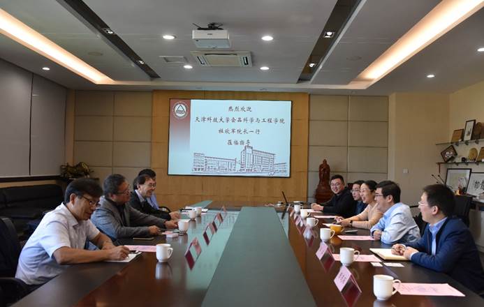 的成长历程、发展情况等进行了全面介绍。杜欣军院长对天津科技大学食品科学与工程学院做了简介。随后双方就学科建设与科研管理、学生教育与管理、院企合作的机制与内容等方面进行了深入交流讨论。
