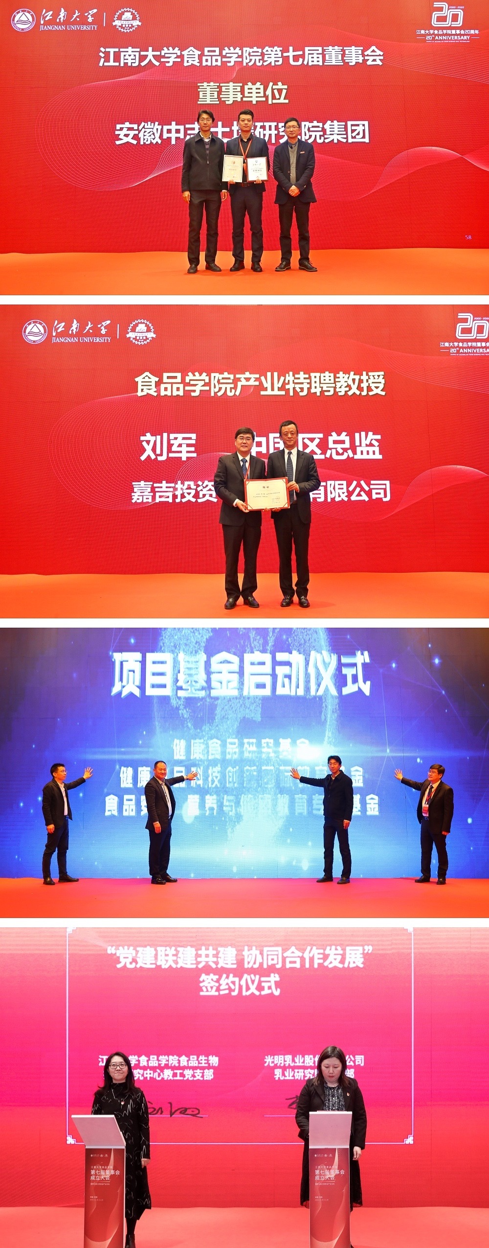 副院长程力宣读了第七届董事会董事单位成员名单,张凌浩副校长为董事单位成员颁发董事会成员证书,李强处长为董事单位颁发健康食品产业创新发展共同体证书。随后,刘元法院长为企业专家颁发产业特聘教授证书。