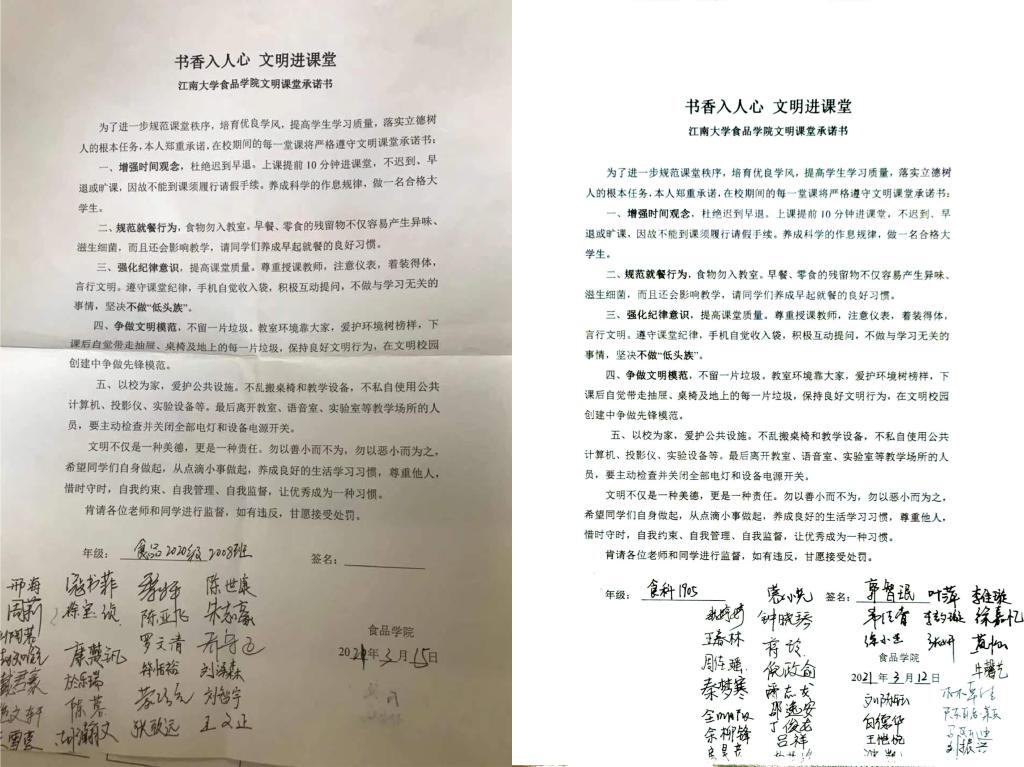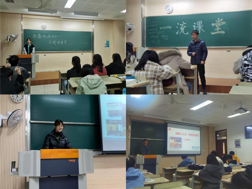 各班级积极举行“书香入人心•文明进课堂”主题班会。辅导员、班主任、学生骨干等纷纷走上讲台,向同学们阐明文明课堂建设的重要意义,动员签署承诺书,号召全体同学自觉履约。通过“文明教室”公约、“文明课堂”承诺书等方式,同学们纷纷表示要自觉杜绝课堂不文明行为,努力维护良好的课堂教学氛围。