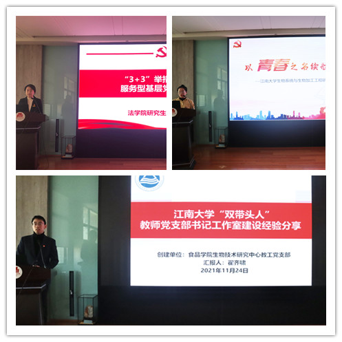 第一批高校“双带头人”教师党支部书记工作室、江苏省特色党支部食品生物技术研究中心教工党支部书记翟齐啸,“全国研究生标杆党支部”生物工程学院生物系统与生物加工工程研究室党支部书记张海云,“全国第二批标杆党支部”法学院研究生第一党支部书记丛毅竹先后进行了交流发言,介绍了党支部在创建工作的做法和经验,起到交流借鉴、比学赶超的积极作用。