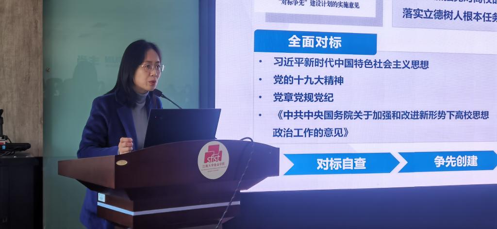 最后,学院党委书记傅莉莉回顾、梳理、总结了学院在创建“全国党建工作标杆院系”中的做法和阶段性成果,并部署下一阶段学院党委将高标准确保“对标争先”全面覆盖,强示范确保“对标争先”可学可鉴,多举措确保“对标争先”深入推进,要求基层党支部严格对标看齐,努力争创先进,严格保质保量完成党建“基本动作”,结合实际打造党建“特色品牌”。