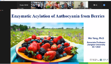 张文斌教授、郑召君副研究员、杨巍副教授分别以“Aqueous extraction processing of sunflower seed for oil and protein recovery”,“Osteogenic effects of Calcium-binding peptides”和“Enzymatic Acylation of Anthocyanin from Berries”为主题进行学术报告,介绍了各自的研究成果。报告引起了与会师生的浓厚兴趣,双方就相关研究细节和应用展开了积极讨论与互动。