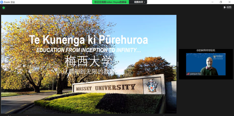 和梅西大学联合办学项目的合作质量和成效;Julian Heyes教授介绍了梅西大学优美的校园环境、办学条件、教育理念、校园文化、大学生活以及学生们的学习方式,并欢迎新生2025年到新西兰梅西大学学习和生活;Richard Love博士线上给同学们简要讲述了项目的发展历程,特别是针对同学们的学习提出了期许和建议。
