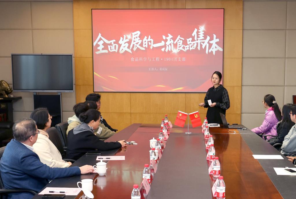 团支书姜成辰以《全面发展的一流食品集体》为题,从我们的集体、奋斗的四年、未来的发展等三个方面汇报了食科1904团支部的成长历程,展现了一流班团集体中一流食品学子的青春蜕变。