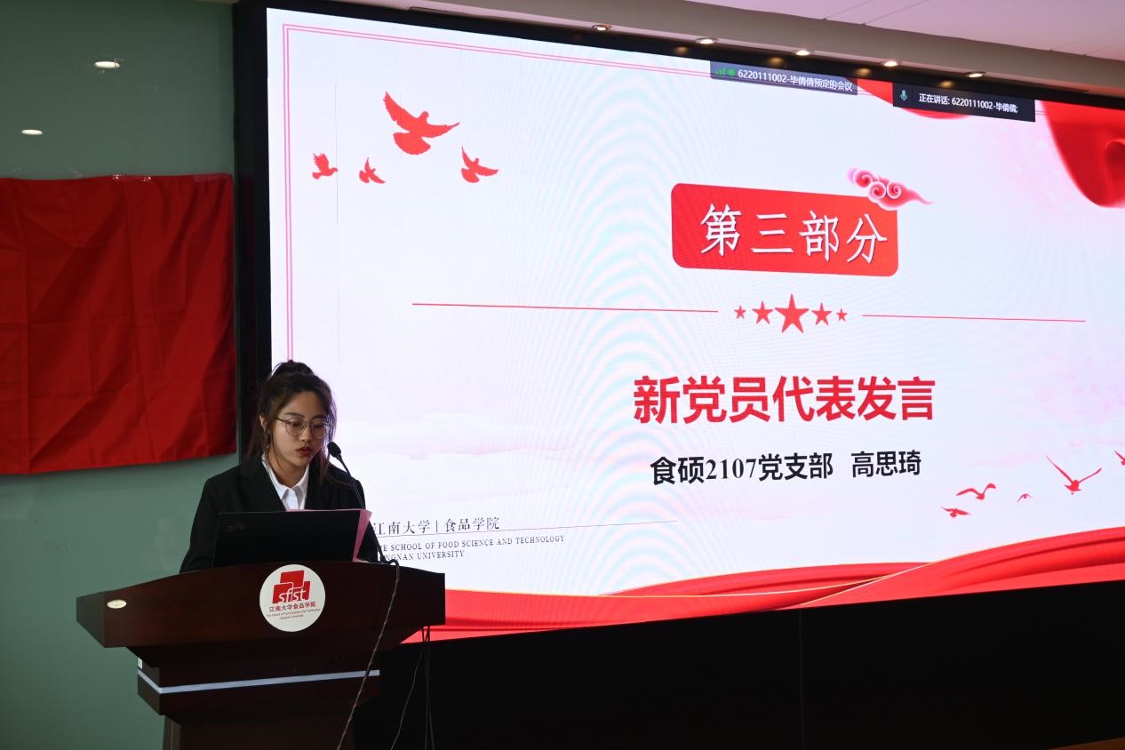 食硕2107党支部高思琦同志作为新党员代表发言。她表示将坚定理想信念,牢记党的宗旨,时刻不忘党员先锋模范作用,坚持用习近平新时代中国特色社会主义思想指导实践、增强本领。