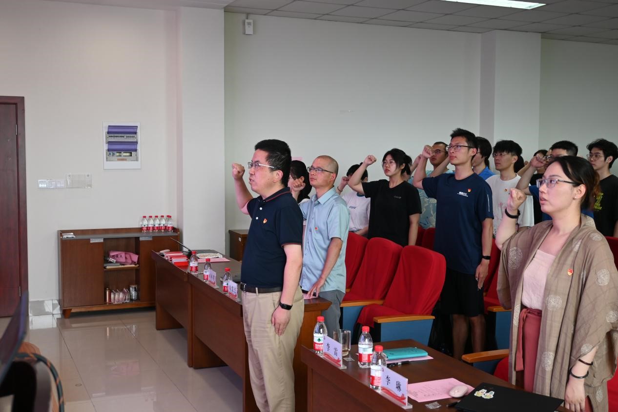 会议伊始,奏唱国际歌。随后,李雷带领2023年新发展党员面向党旗庄严宣誓,其余参会党员一起重温入党誓词。
