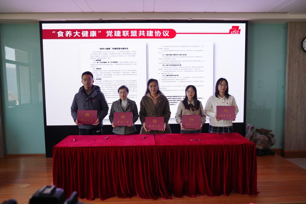 董美华,曹瑛及油脂与植物蛋白研究中心博士党支部书记孙彦文,营养与功能食品工程技术、国家工程实验室联合博士党支部书记袁蕾,谷物与淀粉工程研究中心博士党支部书记何萌分别代表党建联盟的五个盟员党支部共同签署合作共建协议。