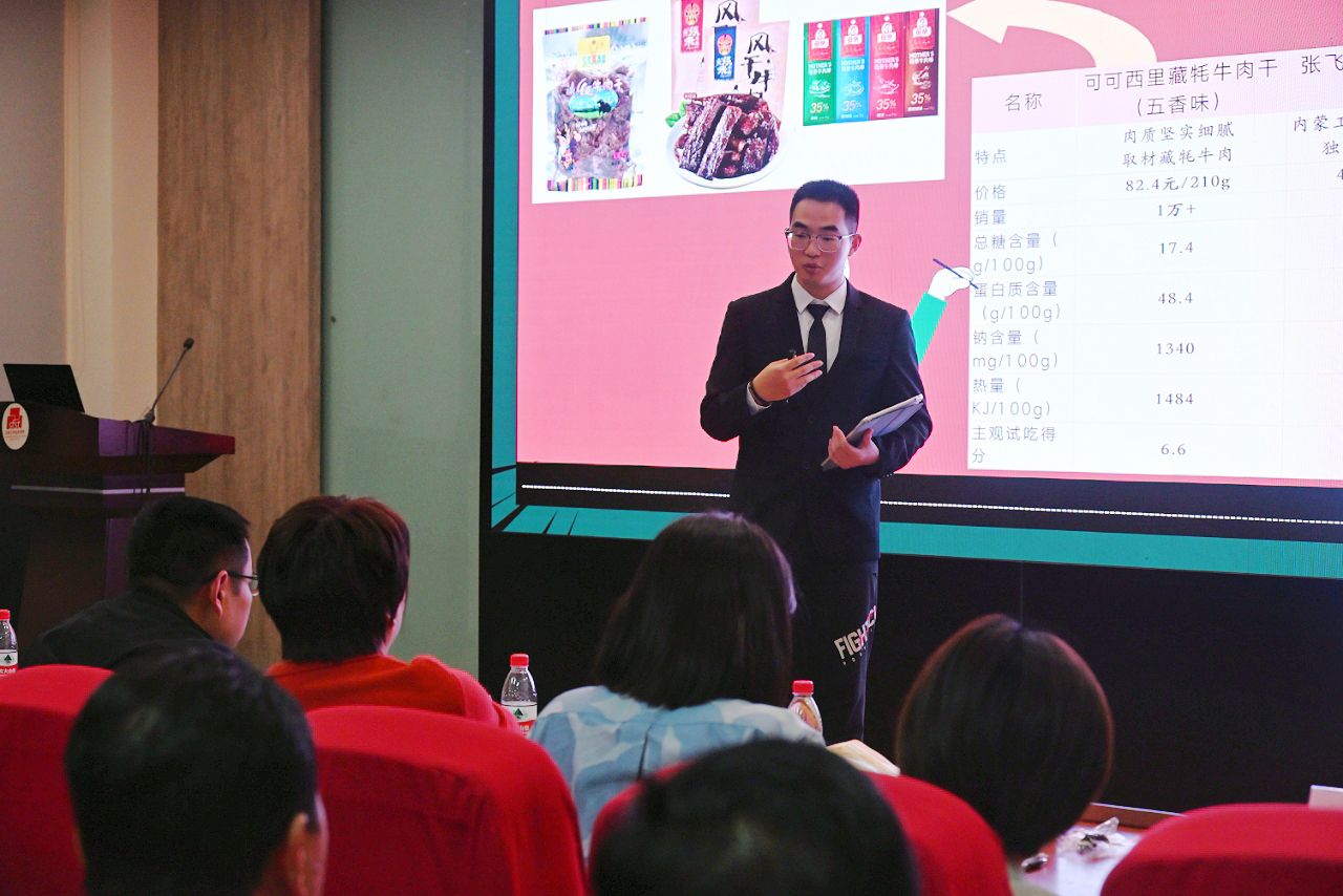 比赛过程中,各支队伍按抽签顺序依次上台答辩,展示作品宣传视频,生动讲解作品设计理念、创新亮点及竞争优势。行业及学校评委从作品的创意概念、技术可行性、口感风味、配方合理性、商业潜力及包装创意等角度与答辩选手展开深度交流,为作品进一步提升提供宝贵建议。