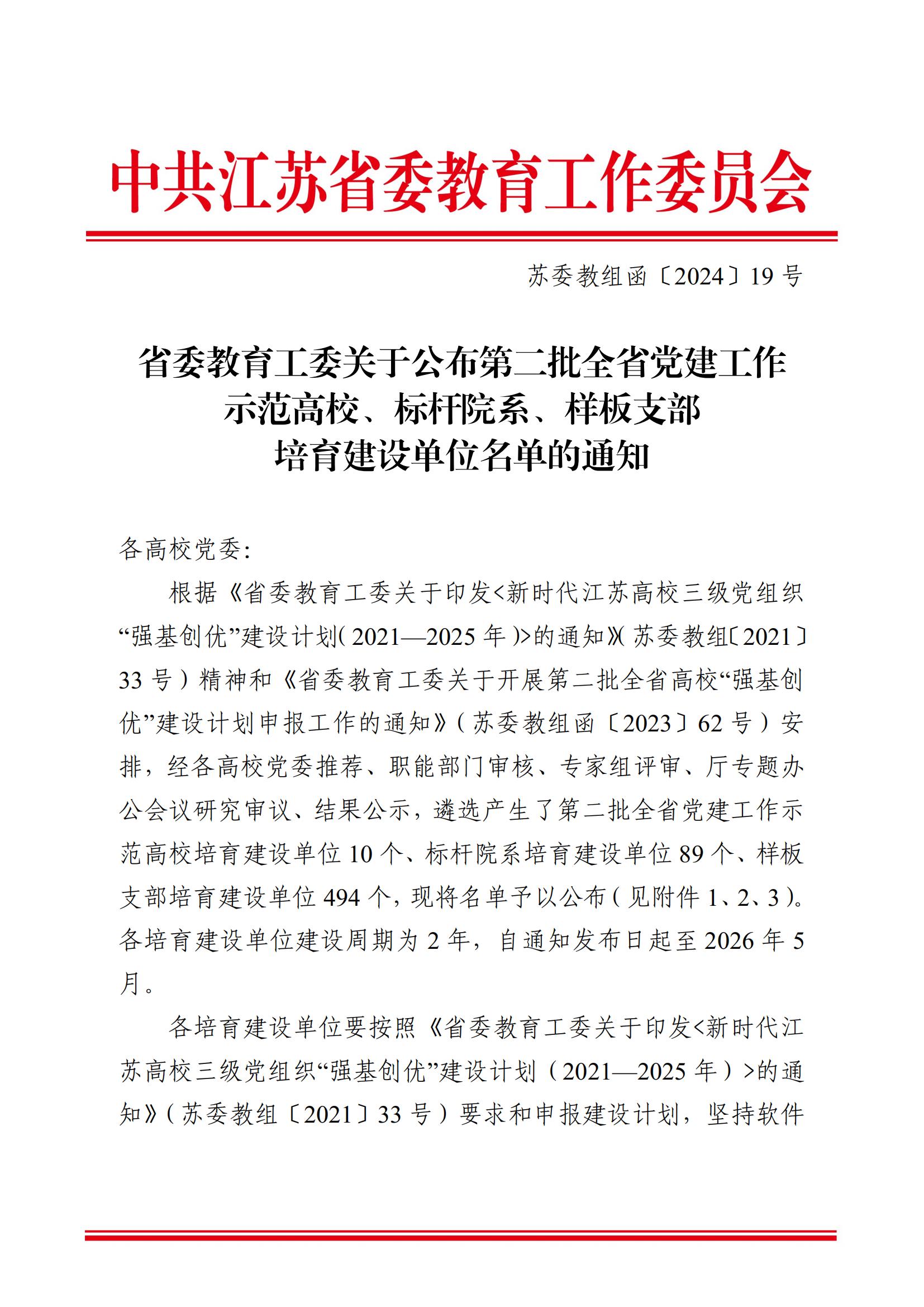 近日,江苏省委教育工委发布《省委教育工委关于公布第二批全省党建工作示范高校、标杆院系、样板支部培育建设单位名单的通知》(苏委教组函〔2024〕19号)。我院谷物与淀粉工程研究中心博士党支部成功入选第二批“全省党建工作样板支部”培育建设单位。