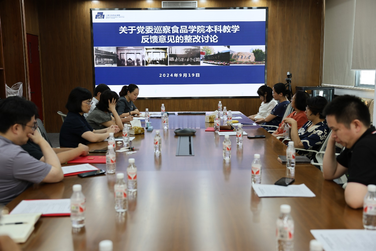 本科教学条线组织召开关于党委巡察本科教学反馈意见的整改讨论会,学院党委书记傅莉莉,食品科学与工程系、食品质量与安全系、食品营养与健康系系主任和副系主任,院教学督导组以及专业核心课负责人出席讨论会。会议由副院长谢云飞主持。