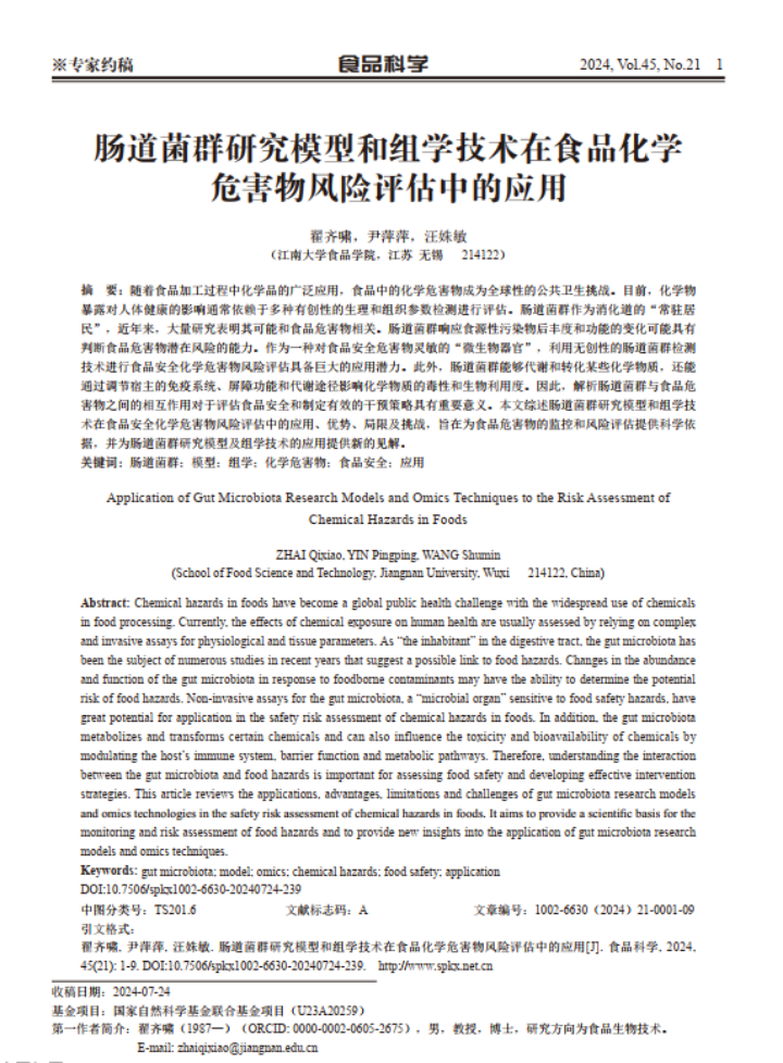 翟齐啸教授受邀在《食品科学》杂志发表题为《肠道菌群研究模型和组学技术在食品化学危害物风险评估中的应用》的学术综述。该篇综述内容基于翟齐啸此前出席联合国粮食及农业组织(FAO)在意大利罗马举办的“食品安全化学风险评估中的肠道微生物组”技术会议时的报告内容。