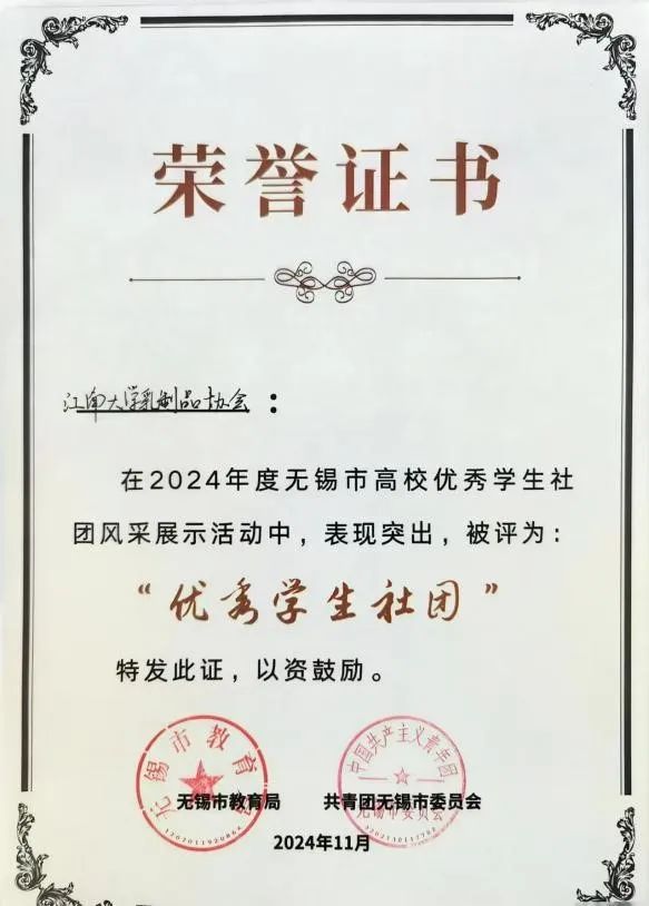乳制品协会最终荣膺无锡市大学生“优秀学生社团”。作为获奖社团代表,乳制品协会还受邀参与第二届无锡市大学生科技系列活动启动仪式。