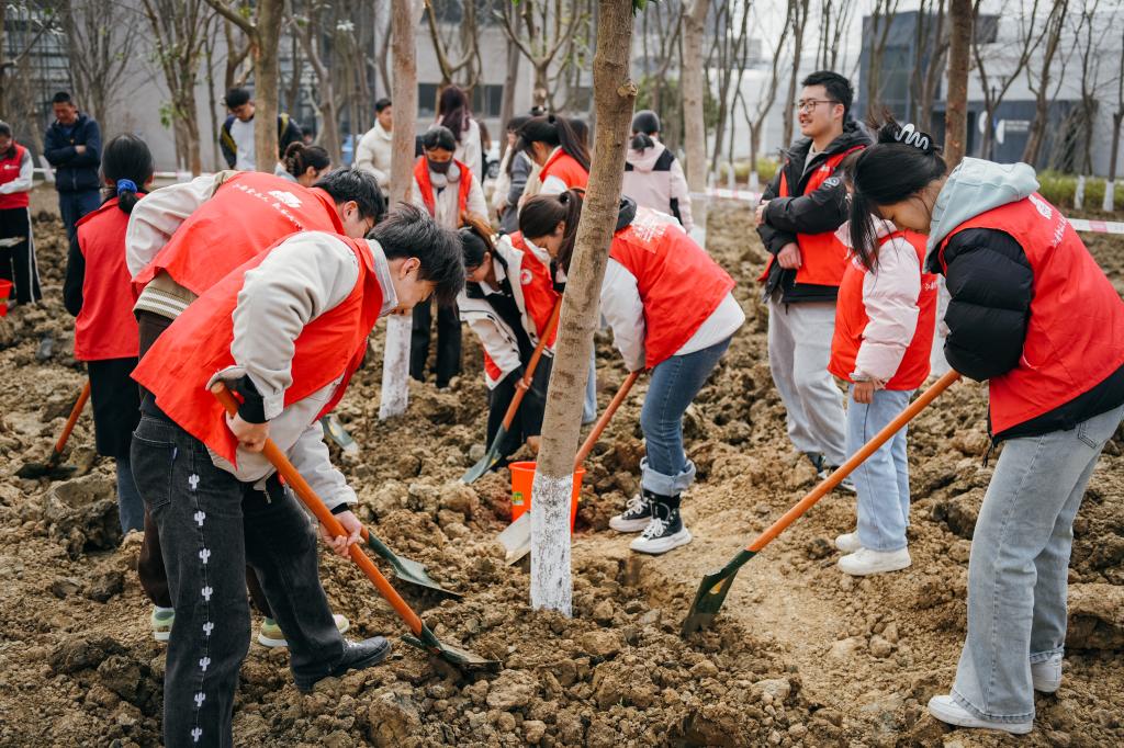 50余名学生以6人一组的形式领取铁锹与水桶等工具进入场地,有条不紊地挥锹铲土、扶苗培土、围堰浇水,齐心协力种下一棵棵树苗。环境中心的老师们全程悉心指导,确保每棵树苗都达到“树干垂直、根系舒展、土球完整”的验收标准。经过一个多小时的辛勤劳作,20余棵新栽种的杜英在春日暖阳中昂然挺立。