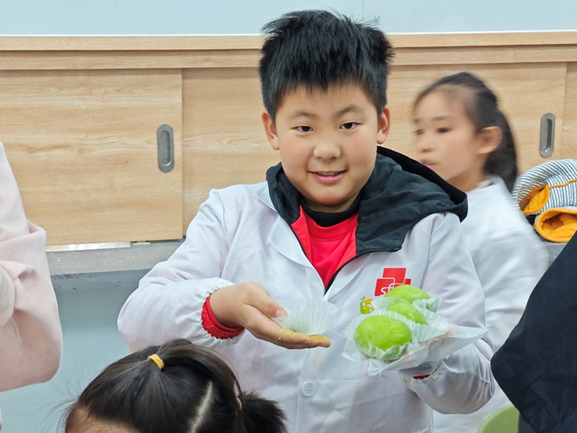 理论课堂结束后,活动进入最受期待的实践环节。“江小娃”们换上实验服,摇身变成“小小美食家”,在助教老师们的指导下动手制作青团。揉面、包馅、封口,每一步都趣味十足,“江小娃”们专注而认真。麦青的清香弥漫在教室中,孩子们的巧手将碧绿的面团捏成圆润的青团,更有创意十足的小朋友制作出元宝、包子等别致造型。当他们捧着亲手制作的青团时,脸上洋溢着满满的成就感。