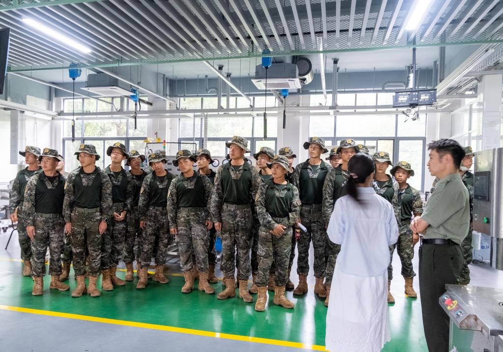 随后,教官们以两路纵队整齐移步至食品工坊实验室继续参观。工坊配备多种食品加工设备,包括烤箱、冰淇淋机、搅拌机、均质机等,区域化布局功能清晰。教官们近距离参观了从原料处理到成品包装的全流程加工设备,了解了不同设备在食品质构调整、风味提升及安全控制中的关键作用,感受理论与实践的深度融合。