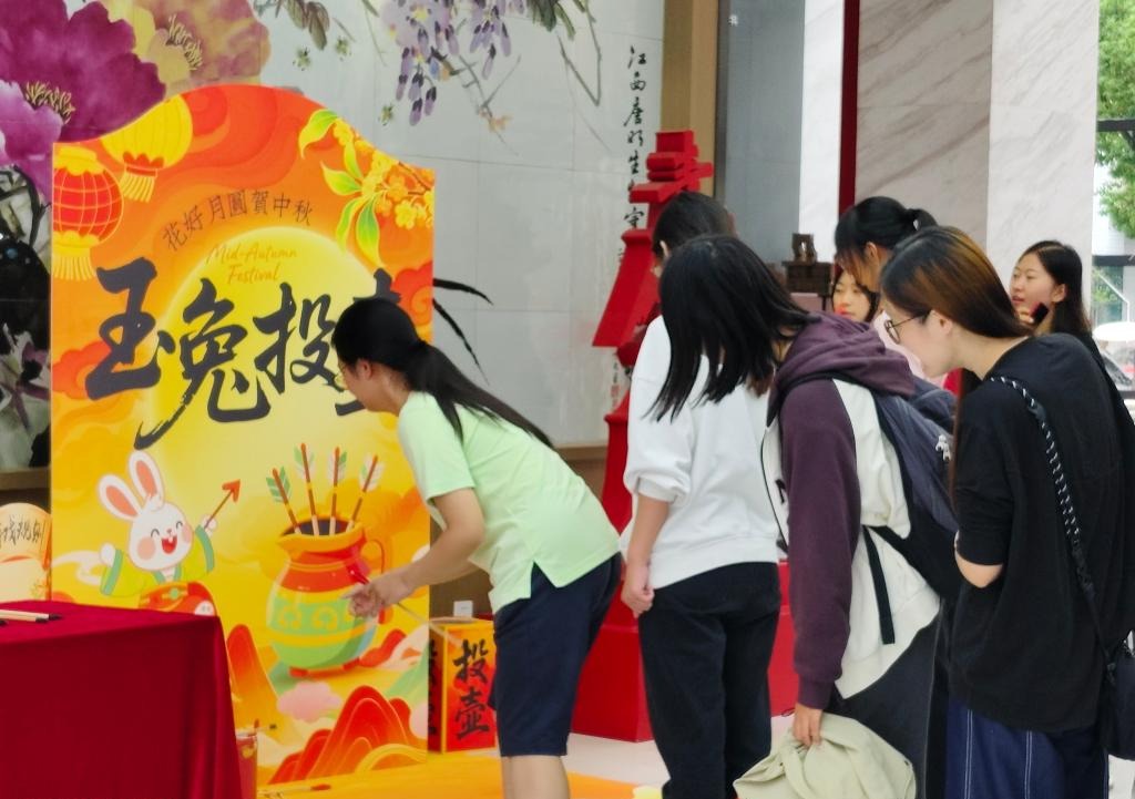 学院一楼的投壶活动区气氛热烈,箭矢落壶的清脆声响与阵阵喝彩交织。月饼抱枕、玉兔书签、清雅香囊……每一份礼品都承载着惊喜,每一次尝试都迸发着欢笑。传统游艺与现代校园和谐相融,织就这个中秋最热烈的记忆场景。