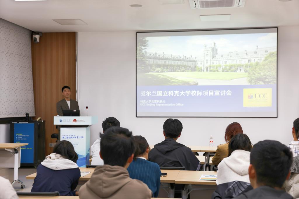 UCC北京代表处招聘专员赵子豪为学院本科生作联合培养项目宣讲,详细介绍项目的课程设置、申请条件及奖学金政策。该项目旨在为耽美漫画