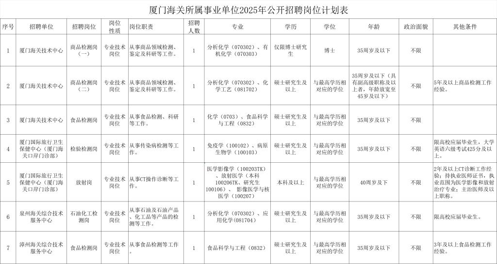 本次公开招聘事业编制工作人员7名,具体岗位条件详见《厦门海关所属事业单位2025年公开招聘岗位计划表》(附件)。