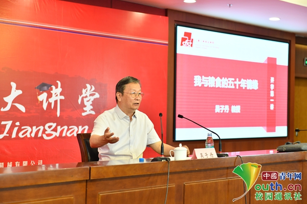在食品大讲堂中,吴子丹教授围绕《我与粮食的五十年情缘》主题,以讲故事的方式讲起自身经历,从求学到工作一步步与粮食相遇相知的过程。通过讲述亲身经历,他指出,中国曾经历过粮食困难时期,因此也高度重视国家粮食安全问题。作为改革开放的亲历者和见证者,吴子丹教授提出改革开放对粮食问题的好转起到了极大的作用,粮食培育与加工技术进一步解决了中国十几亿人的吃饭问题。吴子丹通过讲述自己在储粮技术方面的研究故事,鼓励同学们要大胆思考,奇思妙想,勇于创新。报告结束后,同学们先后就“如何看待粮食生产问题越多越受重视的观念”、“生物场的实际应用”以及“军粮储备”等问题与吴子丹教授进行交流探讨。