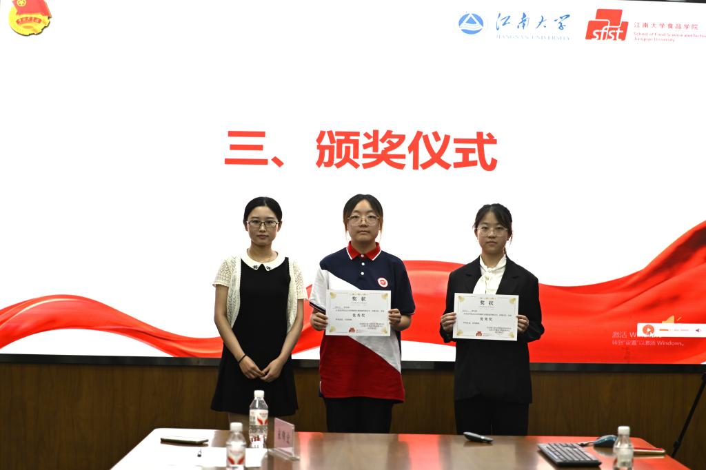 最终,食品科学与工程2024级卓越创新班团支部获“荣毅仁特称团支部”称号;食品营养与健康2301团支部获“皮旅特称团支部”称号;食品质量与安全2401团支部获“远望号特称团支部”称号,食品营养与健康2302团支部、食品营养与健康2402团支部获“雷锋特称团支部”称号。朱雅东、李金杰、胡卉君为获评特称称号的各团支部颁发证书并合影留念。
